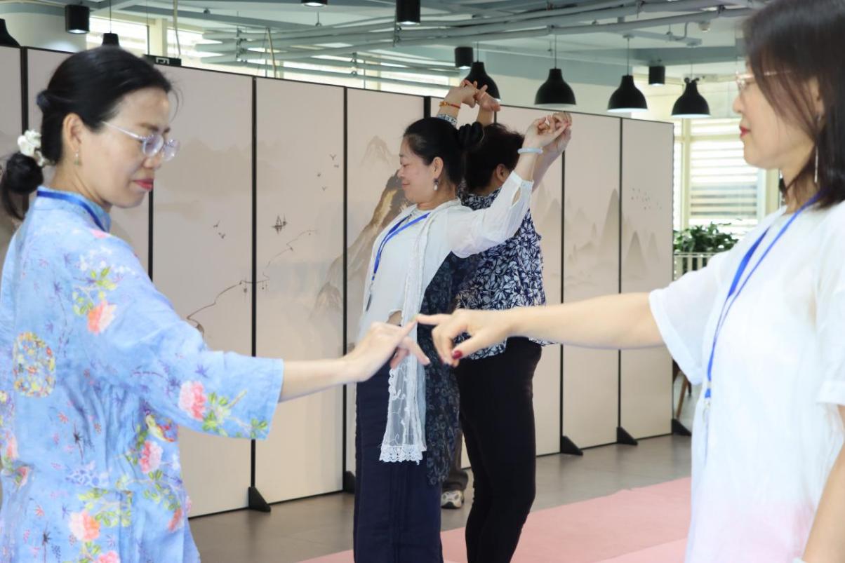 本次活动分为“律动破冰”、“指尖互动”、“即兴绘画”、“舞动身心”、“艺术长廊”几个部分。朱聃首先带领大家进行破冰活动,随后邀请大家进入到肢体互动中,在闭上双眼的指尖触碰中感受人与人之间心灵的交流,现场气氛在老师们的欢笑和互动中渐渐活跃起来,老师们纷纷分享本环节体验。