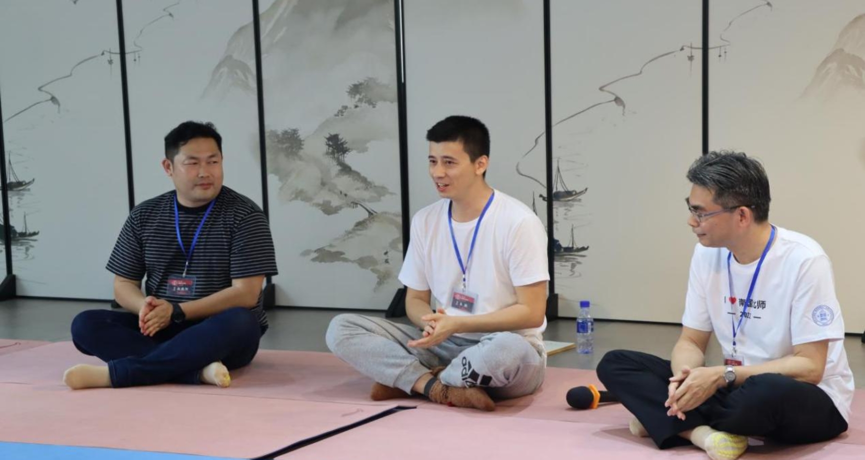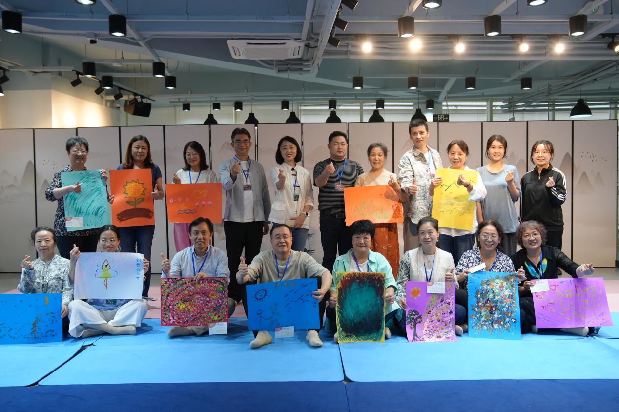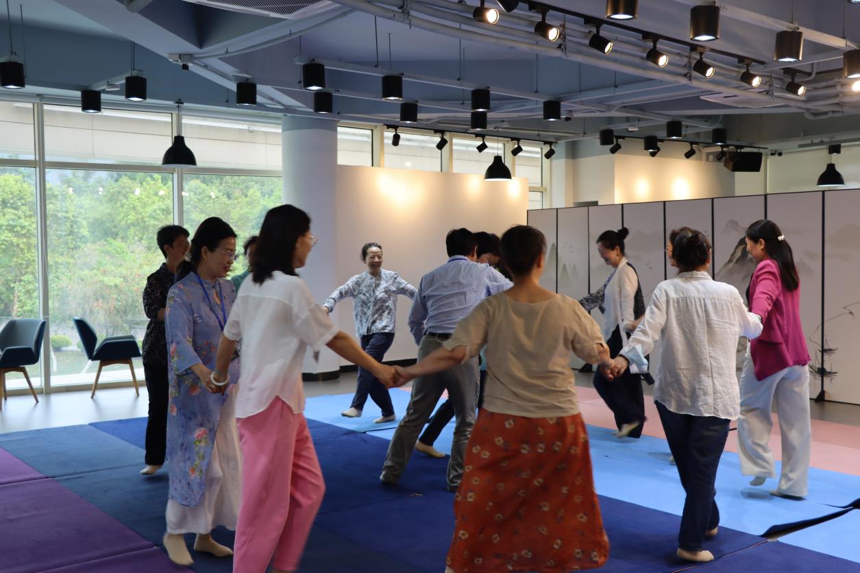随后老师们带着先前那份深沉而美好的情感体验慢慢流动至“舞动身心”区,感受自我律动。气氛也在激昂向上的音乐旋律中被推向高潮,老师们纷纷化身为五彩斑斓的颜料,尽情挥洒,迸发独属于自我的生命力。在朱聃的引导下,老师们积极与他人互动,在互动中感知他人的情绪,与此同时,也将自己积极快乐的情绪传递给他人。