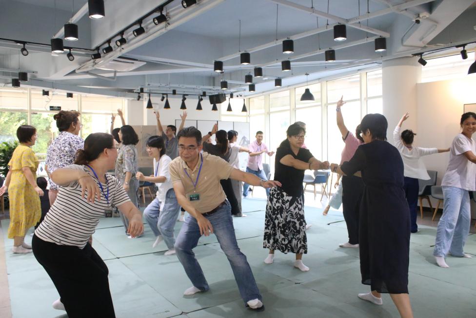 在“肢体节律”环节,曹教授指出,节律是生命的能量波浪,舞动则是能量的传递、转化与升华。她通过介绍五节奏动作——流动、断奏、混乱、抒情、静止,引导大家理解这些节奏是存在的状态,是回归真实自我的标志。通过五节奏自由舞蹈的实践,参与者们体验到了舞动中的自由与释放,感受到了生命在运动中的能量。