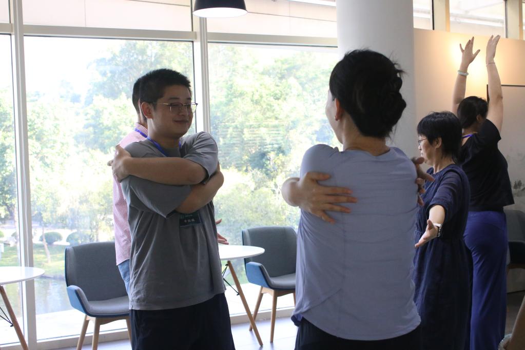 随后,活动进入了“动觉共情”环节。曹教授强调了用肢体感觉聆听的重要性,并带领大家进行了镜像舞动的实践。在结伴互为参照者和镜子的互动中,参与者们不仅确认了自我,还学会了接纳彼此,增强了表达与理解能力。这一环节加深了大家之间的情感联系,让彼此在舞动中找到了更多的共鸣与理解。