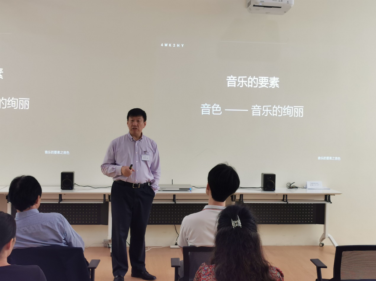 梅弘夫从音的要素与音乐的要素谈起,结合音乐的一些基础知识,从旋律、节奏、和声、音色、力度、速度、配器七个方面对相关乐曲进行分析、讲解与欣赏。他深入浅出地将枯燥的音乐理论与优美的中外名曲相结合,在带领老师们欣赏美妙乐曲的同时,又充分地展示了音乐的语言以及音乐是如何表达情感的。