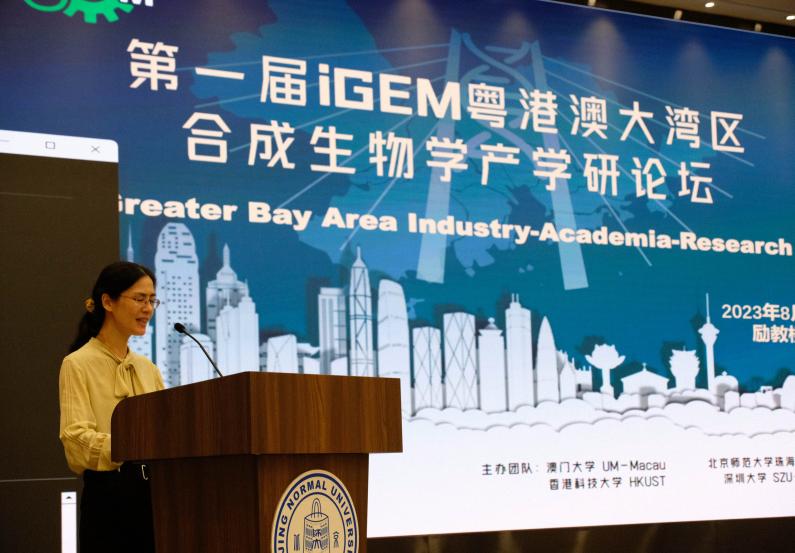 bnuzh-china团队负责人张根发教授对igem竞赛进行介绍,同时通过列举各igem团队的成就,表达了对于合成生物学发展前景的美好希冀,也表达了对于粤港澳大湾区的合成生物学产学研合作的期盼。
